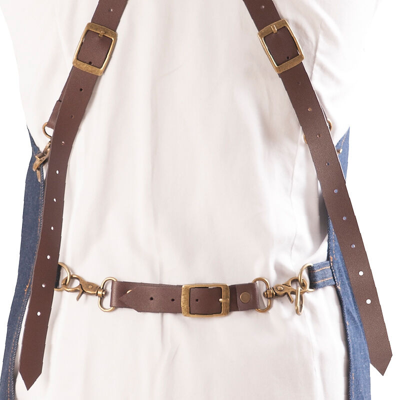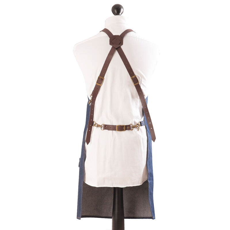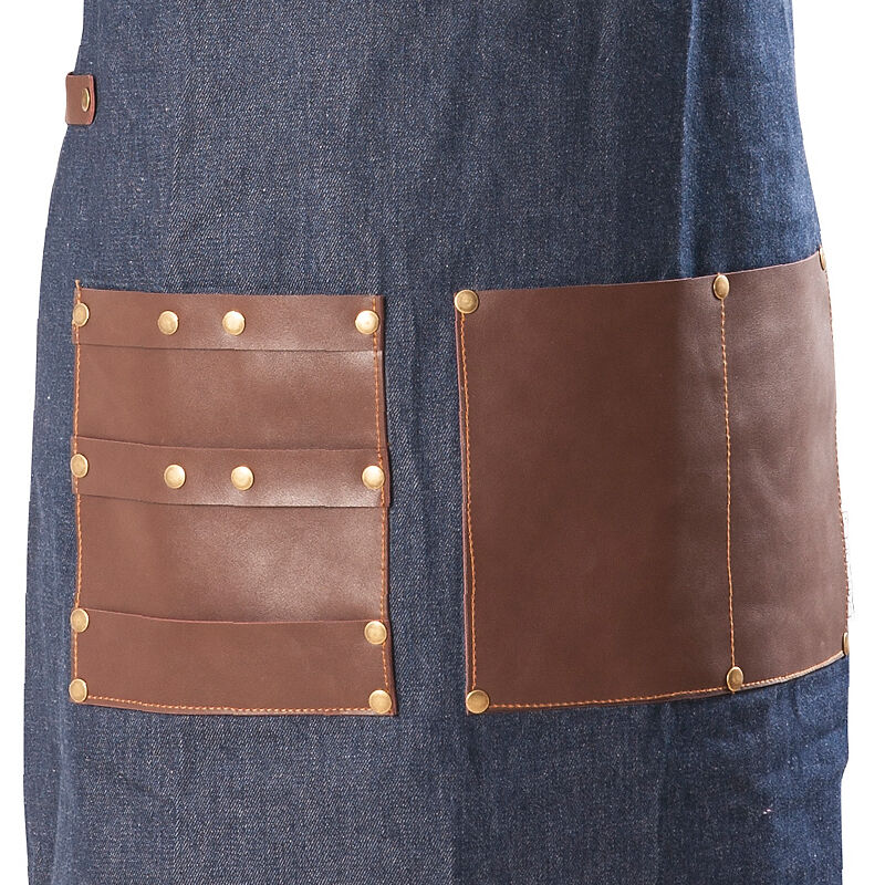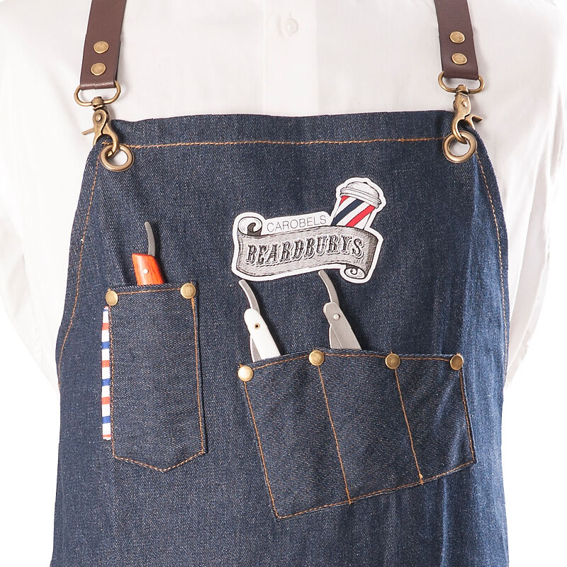 Barber apron made in denim and imitation leather. Resistant and flexible. One size fits with adjustable straps that could be removed for easy cleaning. Washable. It has 4 small pockets at the top for combs and scissors, a towel holder and two large pockets at the bottom, one of them with scissors carriers. A style reminiscent of genuine barbers.